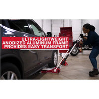 The American Forge & Foundry 208 2-Ton Aluminum Service Jack is a professional grade service jack that combines the strength of steel with the lightweight benefits of an anodized aluminum frame. Polished plunger pistons provide a smooth surface for a longer seal life. Features a twin hydraulic system for faster and easier lifts with a double pumper technology for maximum speed, front rollers for easy portability, wiper seals to prevent dirt from entering the hydraulic system, machining also ensure the tightest tolerances, and a padded 2-piece handle. The standard AFF (1) Year Warranty applies with over 300 service centers nationwide.