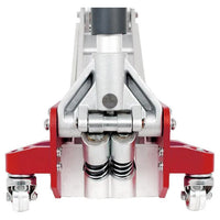 The American Forge & Foundry 210 3-Ton Aluminum Service Jack is a professional grade service jack that combines the strength of steel with the lightweight benefits of an anodized aluminum frame. Polished plunger pistons provide a smooth surface for a longer seal life. Features a twin hydraulic system for faster and easier lifts with a double pumper technology for maximum speed, front rollers for easy portability, wiper seals to prevent dirt from entering the hydraulic system, machining also ensure the tightest tolerances, and a padded 2-piece handle. The standard AFF (1) Year Warranty applies with over 300 service centers nationwide.