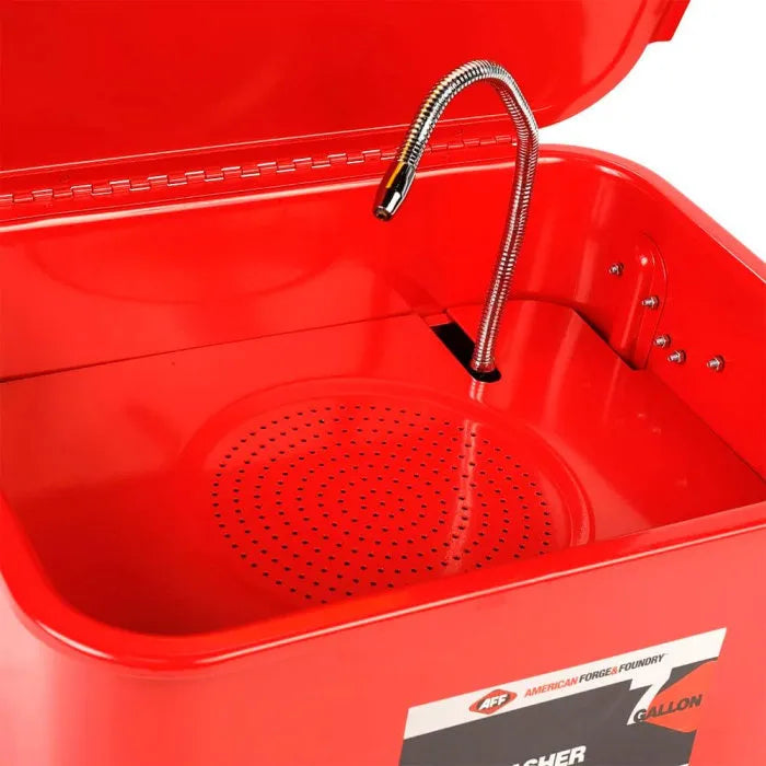 The American Forge & Foundry 31350B 3.5 Gallon Portable Parts Washer is designed for fast and efficient cleaning of vehicle parts and sub-assemblies. Features a durable baked enamel finish and a fusible-linked fire covers for maximum operator safety. Designed for use with aqueous water-based cleaners for faster, more efficient cleaning. UL Listed on complete unit. The standard AFF (1) Year Warranty applies with over 300 service centers nationwide.If you're looking for an economical model that excels above the typical "bargain" model parts washer out there, then check this one out. It provides all you need in one handy little unit, but doesn't sacrifice quality. For instance, the pump is UL listed. How many of those economy models can say that? The pump is built to last. That is the most common issue with those cheap bargain machines out there. Then, look at the quality finish that will hold up to detergents and won't flake off after 6 months. Plus, it's rebuildable. Most economy parts cleaners are throw - aways. Parts are always available with AFF. That bargain model isn't looking so good now, is it?