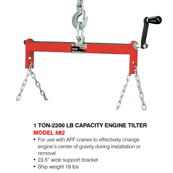 The American Forge & Foundry 582 Engine Tilter has a 2,200 lbs. capacity and quickly attaches to most automotive engine cranes for lifting stability and security. This impressive engine tilter works with the lifting chain to level out the engine weight by adjusting the angle the engine is held at, making lifting easier and safer. Ideal for use in a range of situations and capable of hoisting even the heaviest of engine blocks. The standard AFF (1) Year Warranty applies with over 300 service centers nationwide.Engine tilters, otherwise known as engine leveling bars and engine lifting bars are a popular accessory for engine hoists. Designed to aid in removal and installation of automobile engines from vehicles. Just attach it to the hook, and secure the engine to it, and it allows you to position the motor in any way you need. Gives you the ability to maneuver the engine into infinite angles for every situation. Allows you to alter the engine center of gravity with minimal effort. Can be used with any AFF engine crane, as well as most other competitive brands models as well.