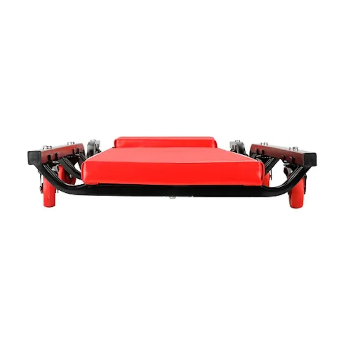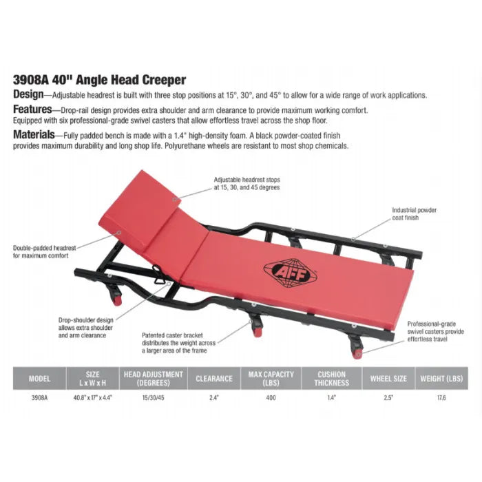 The American Forge & Foundry 3908A 40" Angle Head Six Wheel Creeper allows you to maximize both productivity and comfort when working in your shop or garage. The adjustable head rest is built with 3 stop positions at 15°, 30° and 45° to allow for a wide range of work applications. The drop rail design provides extra working space and additional shoulder and arm clearance. Featuring a 400 lbs. capacity and six professional-grade polyurethane swivel casters that are resistant to most shop chemicals ensures effortless travel across the shop or garage floor. Fully padded bed is made with a 1.4" high-density foam material that delivers superior comfort. Powder coated finish provides maximum durability and long shop life. The standard AFF (1) Year Warranty applies with over 300 service centers nationwide.