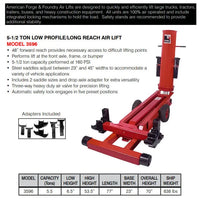 The American Forge & Foundry 3596 Long Reach Air Lift Bumper Jack is designed for raising heavy trucks, buses and other heavy vehicles, with a 5-1/2 ton lift capacity. The 3596 was designed for heavy-duty low-profile vehicles that require a longer reach to get at frame jacking points that are deeper within the frame work.