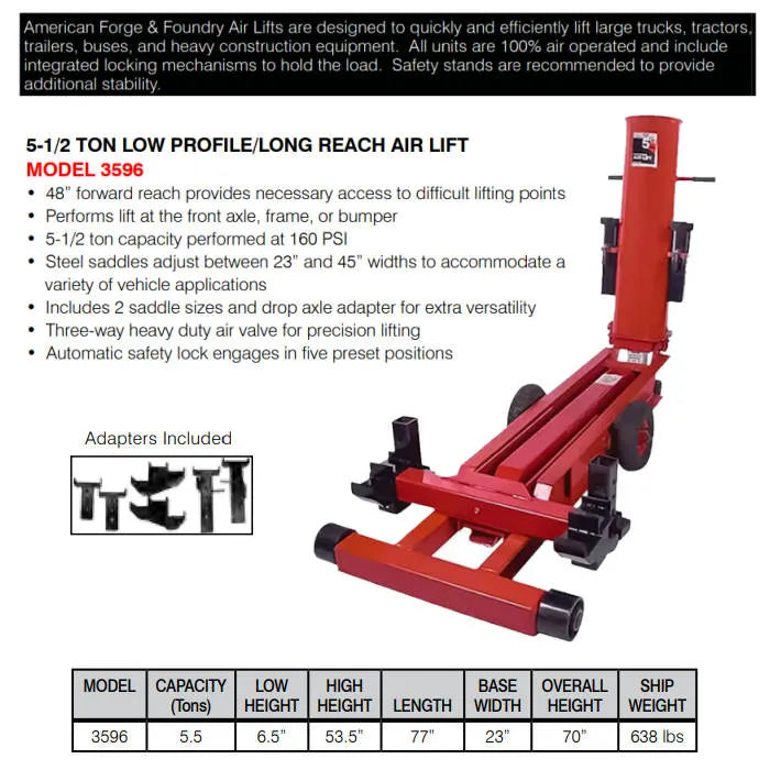 The American Forge & Foundry 3596 Long Reach Air Lift Bumper Jack is designed for raising heavy trucks, buses and other heavy vehicles, with a 5-1/2 ton lift capacity. The 3596 was designed for heavy-duty low-profile vehicles that require a longer reach to get at frame jacking points that are deeper within the frame work. Sometimes a regular bumper jack isn't adequate for the job. Most just don't have the reach to get at center fame jacking points and some vehicles are low profile, and won't allow the typical bumper jack to get underneath without hitting the frame. This long reach air end lift can get the job done. It can reach under and access axles, and other center frame components. The scissor action design and pneumatic lifting at 160 psi provide a 5.5 tons of lifting power that won't let you down. It offers multiple saddle configurations and sizes as well as a drop axle adapter to provide a capability of handling any vehicle. Lifting heights range from a low of 6.5" up to a high of 53.5". It can reach as far as 48" too.