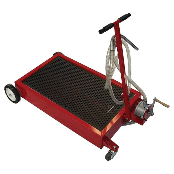 American Forge & Foundry 8877 15 Gallon Portable Low-Profile Steel Oil Drain is ideal for draining oil where a pit or hoist is not available. Steel tank has integrated baffles which capture oil and reduce spillage during transport. Convenient rotary hand pump for fast evacuation of oil from drain into shop collection tank. Large metal screen keeps foreign matter out of recovery tank. Steel handle and 360 degree front casters allow for easy moving and positioning of drain under vehicle. Evacuation hose has metal spout to assist in evacuating oil from drain.