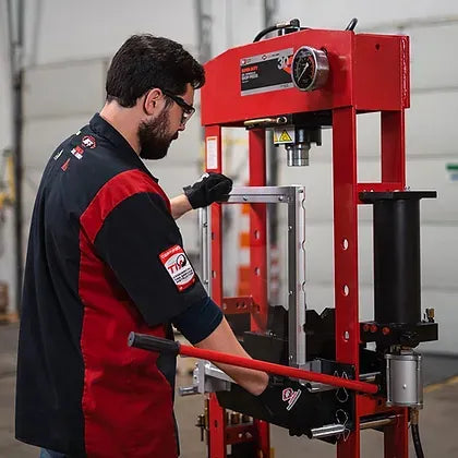 American Forge & Foundry Super Duty Shop Presses are constructed with a fully welded frame and heavier gauge steel for exceptional strength and durability. A lateral head adjuster provides smooth side to side movement of the press head which adds versatility that you won’t find with other standard duty shop presses. Optimal use of shop press is 80% of rated capacity or less.