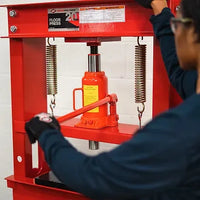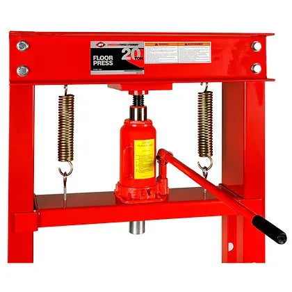 American Forge & Foundry 820A 20-Ton Heavy-Duty Shop Press is designed for automotive shop and lighter industrial applications. Features include eight level bed adjustment, 20-Ton 8-1/2" stroke bottle jack with overload protection, heavy-duty return springs for fast ram retraction, and reinforced head plate.