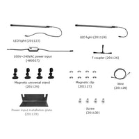 Optional LED Light Kit for Two Post Lifts. Mounts for lights are magnetic and provide universal rotation. Power adapter, mounting plate, wiring, and magnetic wire clips are included.