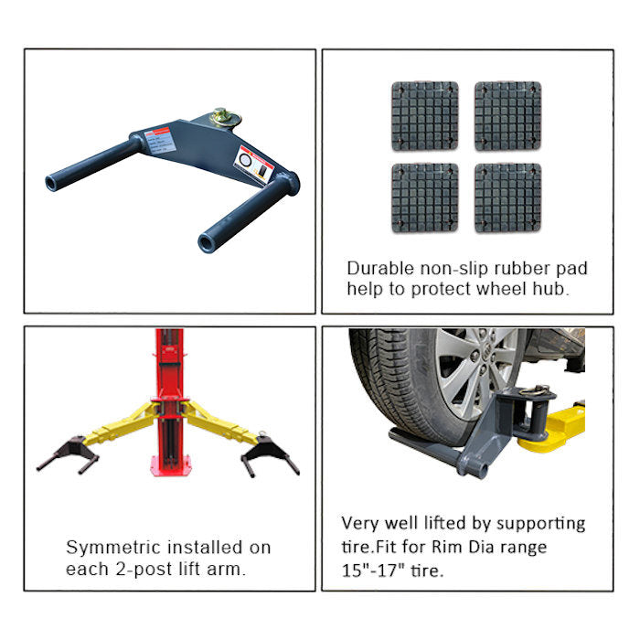 When used as a set of four, the AMGO 20806 Wheel Support Adapter can fast transform a two post lift from chassis-support to wheel-support. This wheel adapter is easy to fix or remove on all AMGO two post lifts and most two post lifts on the market with 1-1/2" to 2" arm holes. Adapter is best suited for 15"-17" wheel diameters. Includes durable non-slip rubber pad to help protect the wheel hub. This wheel adapter provides a wide serviceability for various vehicles, especially for EV maintenance, battery pack replacement, and low chassis vehicles. Sold Individually.
