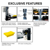 The AMGO 409-DP Double Parking Lift is a space master with 9,000 lbs. capacity. Maximize your garage and create four comfortable parking spaces with one lift and two parking positions to park four vehicles. It's low profile and easy to drive on, featuring hidden safety locks, single-point release, double-s shaped columns for increased strength, and non-slip diamond platforms. Special design structure allows lifts to be installed back-to-back. Foldable drive-on ramps come standard.