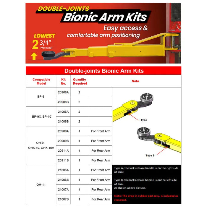 The new AMGO Double-Joint Bionic Arm Kits for two-post lifts enhance the lift's features by offering a minimum pad height of 2-3/4" and 180° free swing, facilitating easy arm access and positioning for various vehicles, including electric vehicles and low-clearance vehicles.