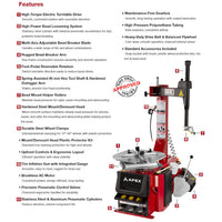 - High-torque electric turntable and rigid construction deliver precise tire mounting and demounting.