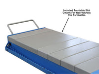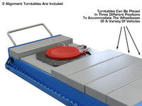 This alignment lift includes a set of front turntables. The turntables may be moved into three different positions, allowing the customer to perform both two wheels and four wheels alignment on the shortest and longest of vehicles. This lift also includes metal turntable cover plates (that cover the cut-outs for the turntables) so that the vehicle is not sitting on the turntable if the lift is not being used for alignment.