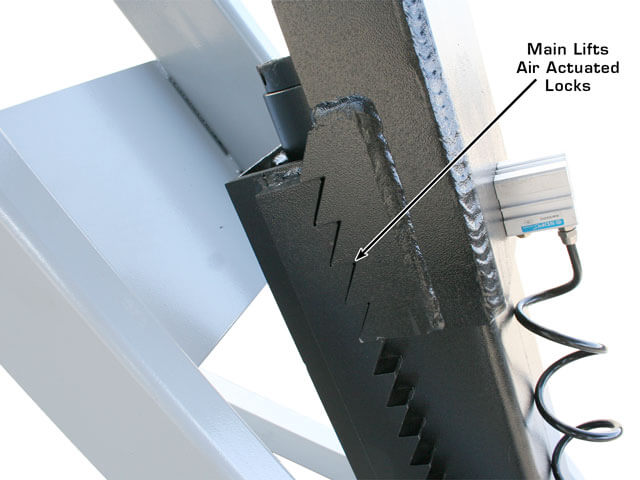 This scissor alignment lift has multiple automatic locking positions to ensure that the lift can be safely used at different heights. The air actuated lock system engages automatically as the lift moves up and is deactivated from the control panel when the lift is ready to be lowered.