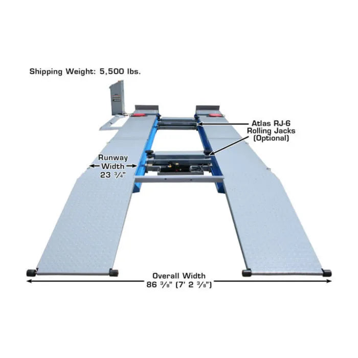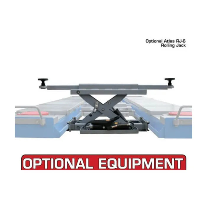 Once a vehicle is positioned on the Atlas scissor alignment lift, the optional Atlas RJ-6 rolling jack can lift the vehicle off of the runways to perform wheel service. The air powered hydraulic Atlas RJ-6 rolling jack has telescoping arms that extend over the runways to access lift points. These jacks have screw out extensions or optional stack on truck adapters. Welded rails on the inside of the runways are standard, allowing the customer the option of incorporating the Atlas RJ-6 rolling jack system on his Atlas scissor alignment lift.