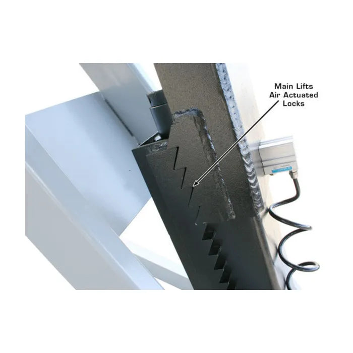 The separate control panel may be conveniently positioned to allow easy access for the operator. The 220 volt (single phase) electric/hydraulic power unit is housed inside the metal control panel box. The push button controls activate the raising and lowering of the lift. The sophisticated air actuated lock system is automatically engaged and disengaged as the lift is being raised or lowered. The lift has a safety lowering limit switch. Once the lift platforms are lowered to within 10 1/2 inches of the ground, the lift automatically stops its descent. The Down button needs to be released and depressed again to allow the lift to go down completely.