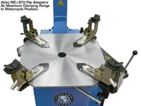 The Atlas Motorcycle/ATV Flip Adapters are designed to enlarge or decrease the clamping range of the Atlas TC221, TC229, and TC289 tire changers. The Atlas Motorcycle/ATV Flip Adapters are installed over the existing turntable clamping jaws to INCREASE the EXTERNAL clamping range of the turntable jaws for motorcycle wheels. The adapters can also be flipped around to DECREASE the EXTERNAL clamping range of the turntable for ATV wheels. The jaws are manufactured from a high density polymer that eliminates the need for optional plastic jaw protectors. These NON-MAR jaws will not damage expensive chrome wheels (if used properly). The height of the Atlas Motorcycle/ATV Flip Adapters clamping jaws allows the wheels to be elevated above the solid wheel clamp turntable. This elevation will allow many rear wheels to be clamped effectively (for the purpose of mounting or demounting a tire) WITHOUT the need to remove sprockets or hubs. The handy Atlas Motorcycle/ATV Flip Adapters are secured to the existing steel jaws (on the turntable) with a locking pin that ensures a positive clamping action by the jaws.