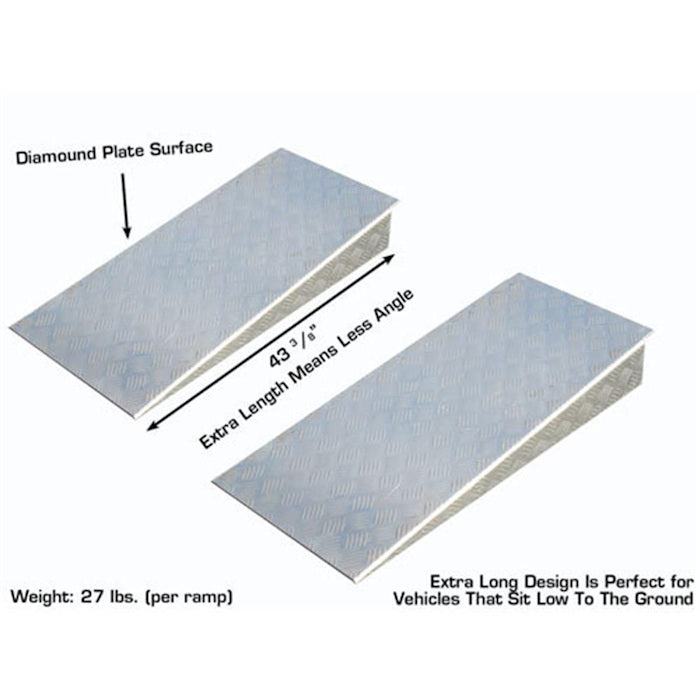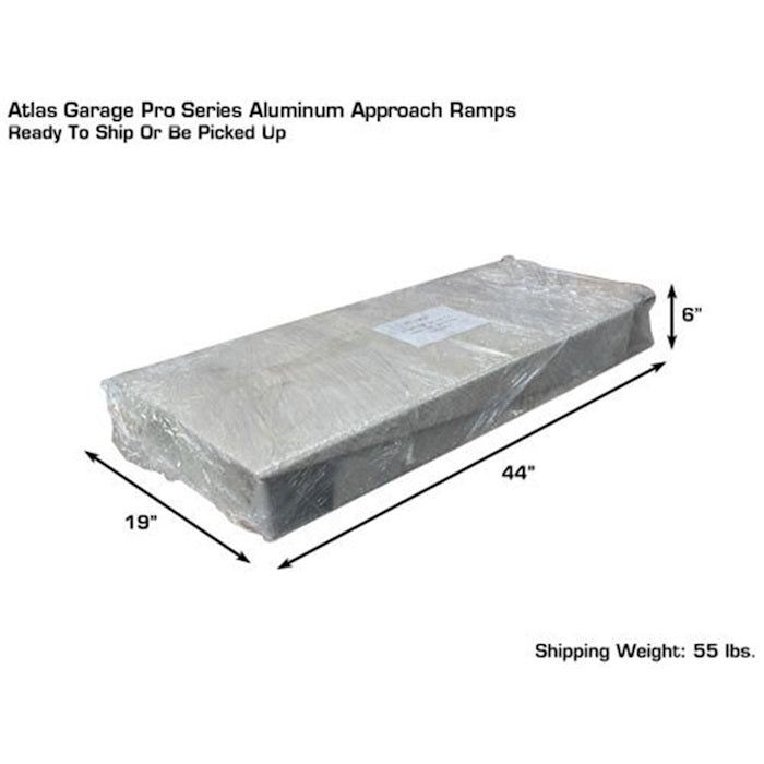These Atlas 40804 Extra Long Aluminum Approach Ramps (pair) are designed to work with the Atlas Garage Pro8000, Pro8000EXT, Pro8000EXT-L, and the ALI Certified APEX8 four post auto lifts. The extra length produces a less steep angle to accommodate low clearance vehicles. These approach ramps are made with lightweight aluminum (with underside reinforcement) so they are easy to move yet very sturdy.