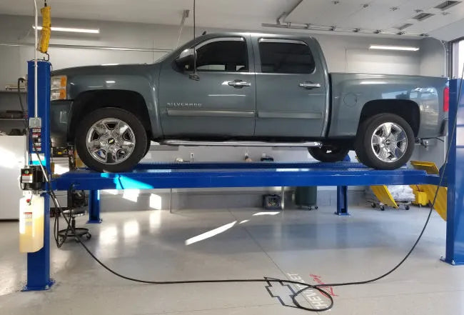 The Atlas 412A uses a high strength cable system (with a under runway oversized hydraulic cylinder) powered by a 220 volt (single phase) power unit to raise and lower the lift. Many competitors use an "old style" chain lifting system with an exposed hydraulic cylinder system. Old style chain lifts are difficult to "level" properly and the exposed hydraulic cylinder is responsible for numerous "door dings".