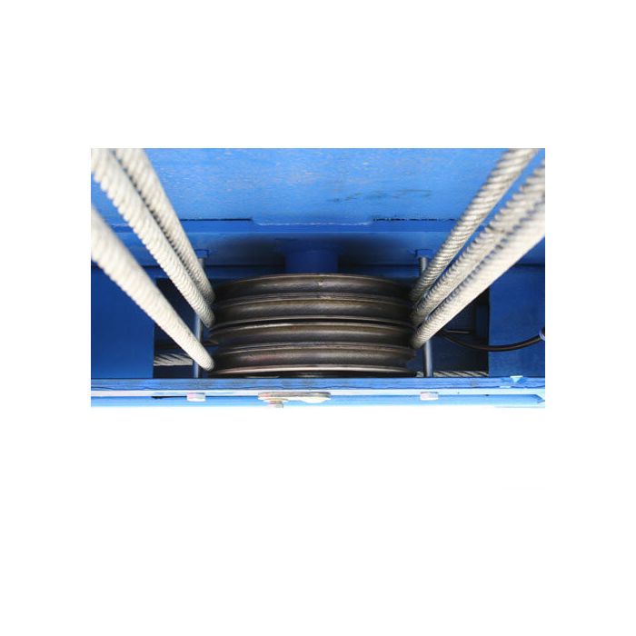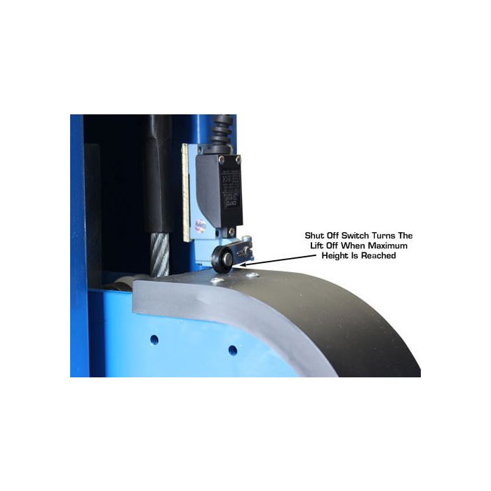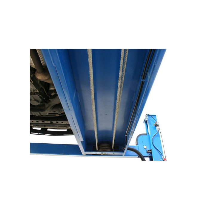 The Atlas 412 uses a high strength cable system (with a under runway oversized hydraulic cylinder) powered by a 220 volt (single phase) power unit to raise and lower the lift. Many competitors use an "old style" chain lifting system with an exposed hydraulic cylinder system. Old style chain lifts are difficult to "level" properly and the exposed hydraulic cylinder is responsible for numerous "door dings".
