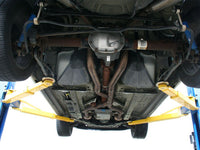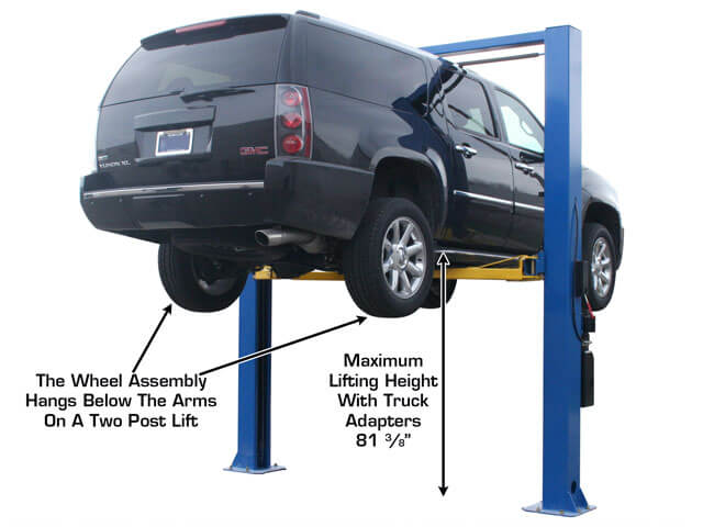 The overhead bar configuration leaves the floor area between the columns open, and allows the operator to easily roll a transmission jack or a tool box under the car.