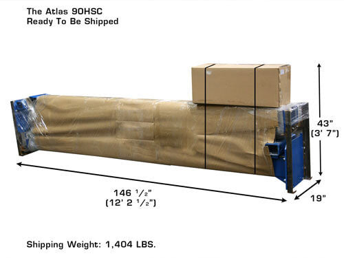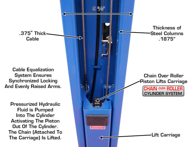 The Atlas 9OHSC has single piece columns and extra long carriages to ensure years of trouble free service. The single piece columns require the customer to have a ceiling of at least 12 feet to stand up the column. A single piece column coupled with the longer carriage offers unparalleled structural support for your types of lifting requirements. The Atlas 9OHSC incorporates a single piece 11' 10" formed column and an extra long carriage that provides maximum column and arm strength to lift and support a 9,000 lbs. vehicle.