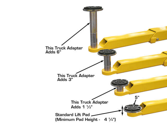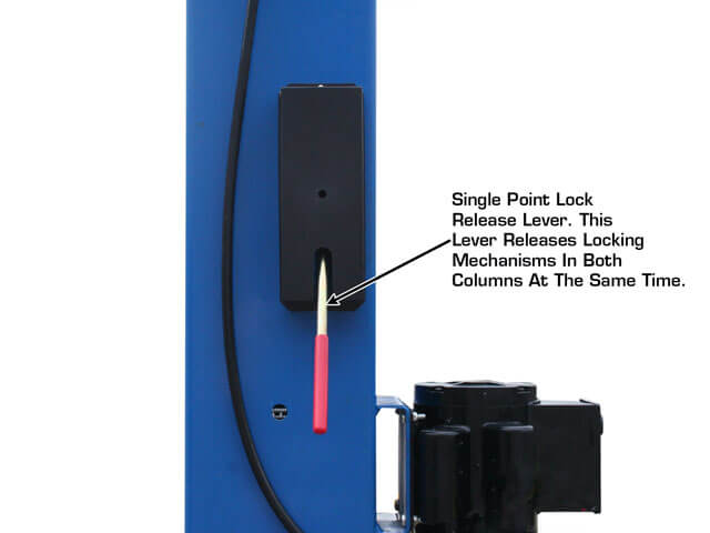Automatic arm restraints are needed to keep the arm "locked" into a position relative to the carriage. When the arms are at rest in the lowest position, the arm restraint pin (which extends below the carriage) is pressed up and the lock (teeth) mechanism is disengaged. The operator can then move the arms so that the lift pads can be properly positioned under the vehicle’s lift points. Once the carriage is raised (approximately 2 inches) the lock is reengaged and the arms cannot be moved. However, the operator may pull the knob or metal ring to manually unlock the arms. Lock restraints do not guarantee that a vehicle cannot be "moved" off of the lift pads. Operator should use care when working on vehicles that have an abundant amount of undercoating (lift pads may "slide") or a significant weight imbalance of the vehicle may occur due to removal of an engine or transmission. Also, "HEAVY wrenching" may result in a vehicle shifting weight on the arm pads. We recommend the use of tall jack stands under the vehicle to add another layer of safety.