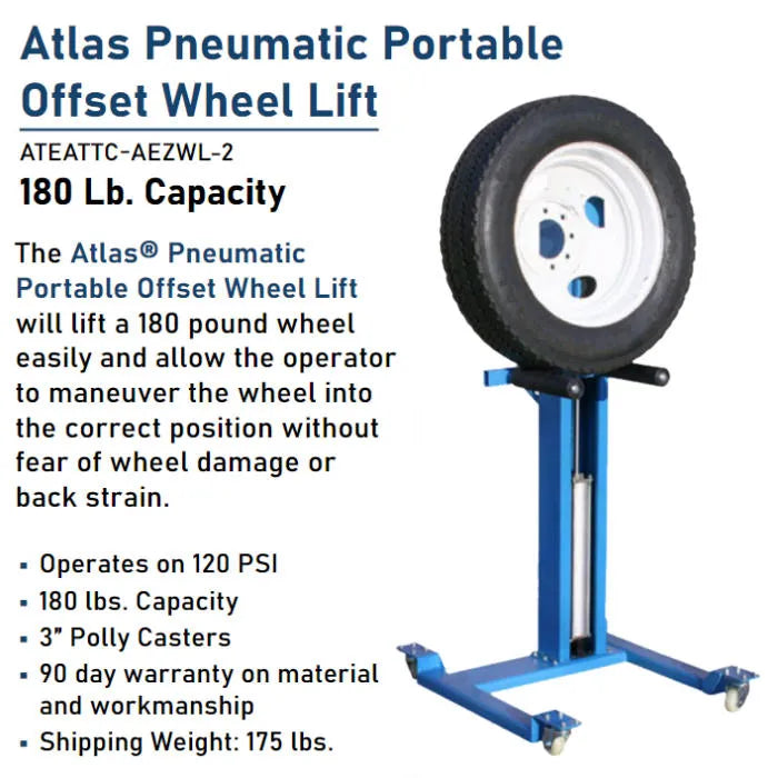 The Atlas AEZWL Pneumatic Portable Wheel Lift is the perfect solution to prevent back injuries when lifting large wheel assemblies onto the shaft of a wheel balancer, onto a tire changer turntable, or even removing or installing tires on a car raised on a scissor or two post lift. Today's wheels and tires are getting bigger and heavier. Many wheels are expensive and can be easily scratched or damaged. Atlas air operated wheel lifts will lift up to a 180 lbs. wheel easily and allow the operator to maneuver the wheel into the correct position without fear of wheel damage or back strain. The AEZWL's smooth air operation requires only 116-145 PSI air pressure and the four swivel casters make it easy to move and position where needed.