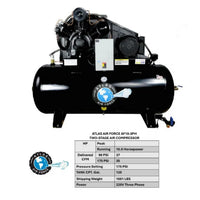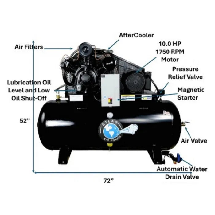 The Atlas Air Force air compressors are powerful, belt driven reciprocating air compressors designed and built to offer years of trouble-free service. The Atlas Air Force AF10-1PH operates between 145-175 PSI. This model comes standard with a USA made 120-gallon horizontal steel tank and also includes a magnetic starter. The magnetic starter controls the electric input and adds to the longevity of the unit. All Atlas AF10 models come standard with the Plus Package. The Plus Package features for our commercial grade two stage air compressors include an Automatic Low Oil Monitor, Automatic Tank Drain, and Air-Cooled Aftercooler. These three features help to extend the life of your Atlas air compressor while also delivering "better air".