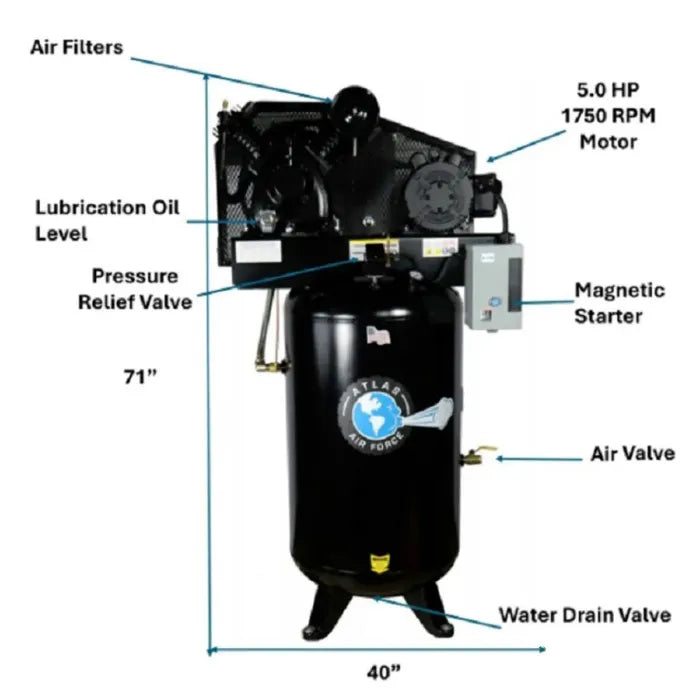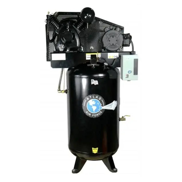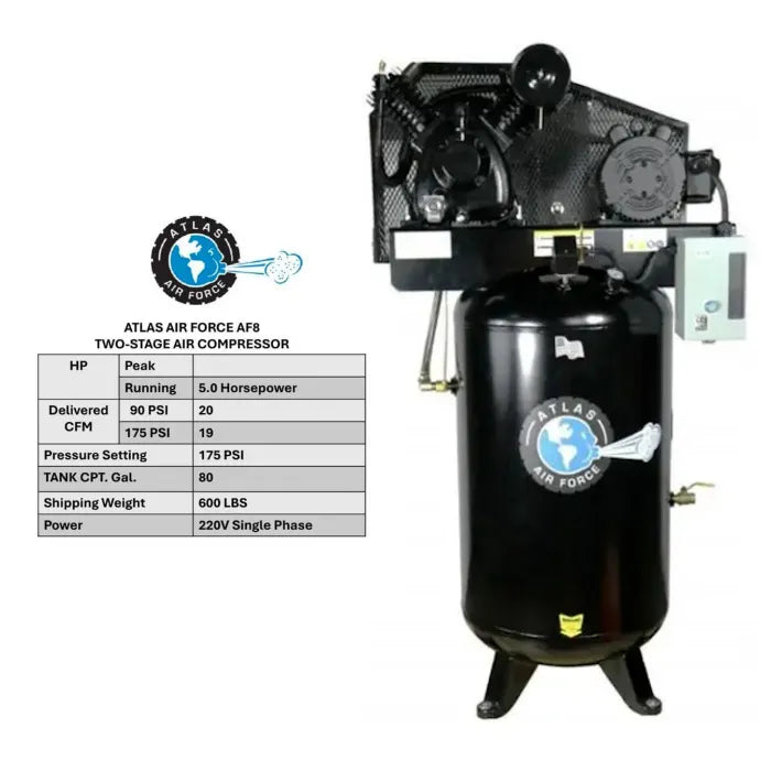 The Atlas Air Force AF8 is the perfect compressor for the 3-4 man auto shop... or for the one man shop that wants to be prepared for future growth. The AF8 is what we recommend for a small business that depends on their air compressor to deliver flawlessly every business day. The Atlas Air Force AF8 operates between 145-175 PSI. The AF8 comes standard with a USA made 80 gallon steel tank and also includes a magnetic starter. The magnetic starter controls the electric input and adds to the longevity of the unit.