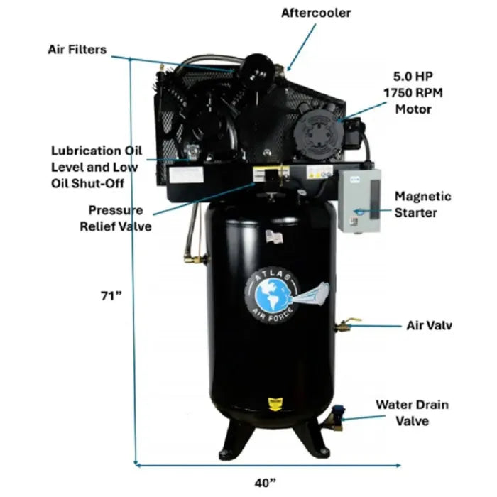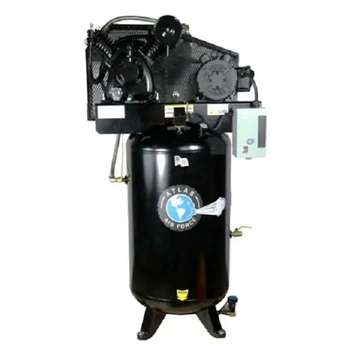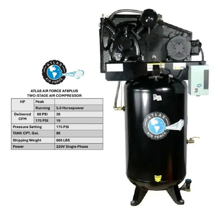 The Atlas Air Force AF8P is the perfect compressor for the 3-4 man auto shop... or for the one man shop that wants to be prepared for future growth. The AF8P is what we recommend for a small business that depends on their air compressor to deliver flawlessly every business day. The Atlas Air Force AF8P operates between 145-175 PSI. The AF8P comes standard with a USA made 80 gallon steel tank and also includes a magnetic starter. The magnetic starter controls the electric input and adds to the longevity of the unit. This version of our popular Atlas Air Force AF8 includes the Plus Package. The Plus Package features for our commercial grade two stage air compressors include an Automatic Low Oil Monitor, Automatic Tank Drain, and Air-Cooled Aftercooler. These three features help to extend the life of your Atlas air compressor while also delivering "better air".