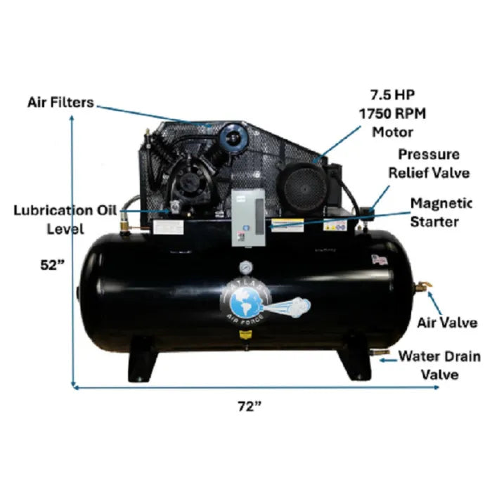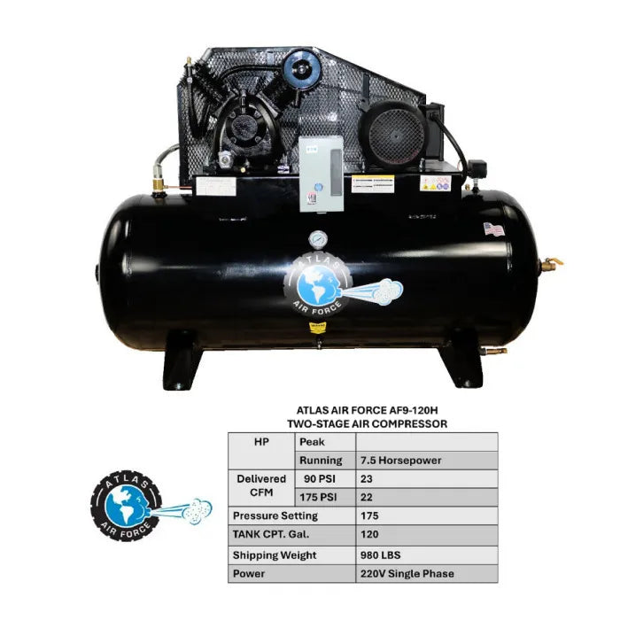 The Atlas Air Force air compressors are powerful, belt driven reciprocating air compressors designed and built to offer years of trouble-free service. The Atlas Air Force AF9-120H operates between 145-175 PSI. This model comes standard with a USA made 120-gallon horizontal steel tank and also includes a magnetic starter. The magnetic starter controls the electric input and adds to the longevity of the unit.