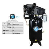 The Atlas Air Force AF9 is the perfect compressor for a large multi-bay auto shop... or for the small shop that wants to be prepared for future growth. The AF9 is what we recommend for a small business that depends on their air compressor to deliver flawlessly every business day. The Atlas Air Force AF9 operates between 145-175 PSI. The AF9 comes standard with a USA made 80 gallon steel tank and also includes a magnetic starter. The magnetic starter controls the electric input and adds to the longevity of the unit.