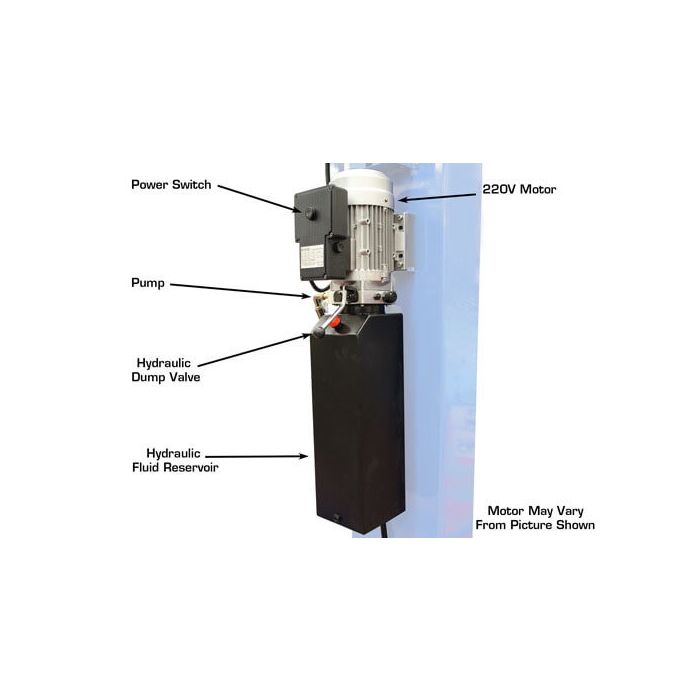 The electric motor for the power unit requires 220 Volt (single phase) 60 Hz (+/- 5%, so 209-231 volts). We recommend using at least a 10 gauge (grounded) wire from the electrical panel. The power unit may or may not have a short pigtail (no plug) that can be wired to either an optional quick disconnect box (mounted on the lift column) or to a male/female plug combination. A 30 amp breaker is required.