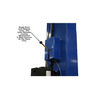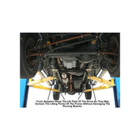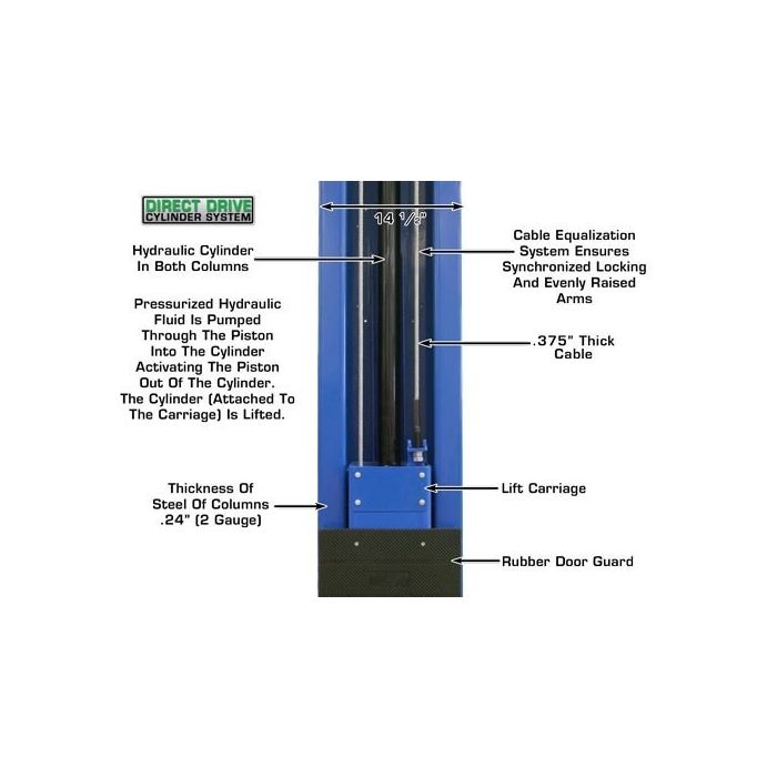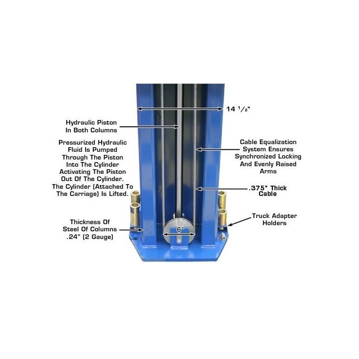 The overhead bar configuration leaves the floor area between the columns open, and allows the operator to easily roll a transmission jack or a tool box under the car. The Automatic Padded Shut-Off Bar located below the cross beam prevents the top of the vehicle from being damaged by hitting the cross beam. The padded bar, which contacted automatically shuts off the motor on the power unit to prevent the vehicle from being lifted.