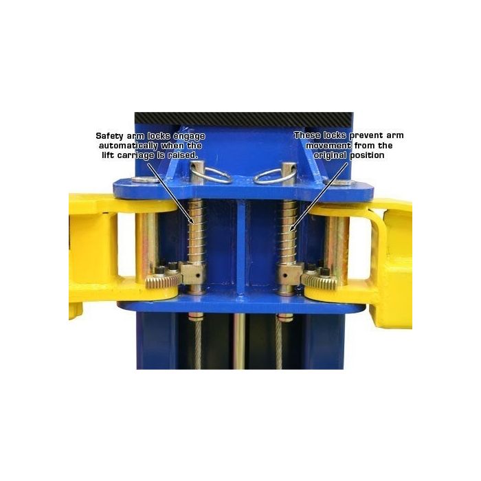These are needed to keep the arm "locked" into a position relative to the carriage. When the arms are at rest in the lowest position, the arm restraint pin (which extends below the carriage) is pressed up and the lock (teeth) mechanism is disengaged. The operator can then move the arms so that the lift pads can be properly positioned under the vehicle’s lift points. Once the carriage is raised (approximately 2 inches) the lock is reengaged and the arms cannot be moved. However, the operator may pull the knob or metal ring to manually unlock the arms. Lock restraints do not guarantee that a vehicle cannot be "moved" off of the lift pads. Operator should use care when working on vehicles that have an abundant amount of undercoating (lift pads may "slide") or a significant weight imbalance of the vehicle may occur due to removal of an engine or transmission. Also, "HEAVY wrenching" may result in a vehicle shifting weight on the arm pads. We recommend the use of tall jack stands under the vehicle to add another layer of safety.
