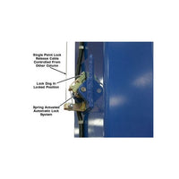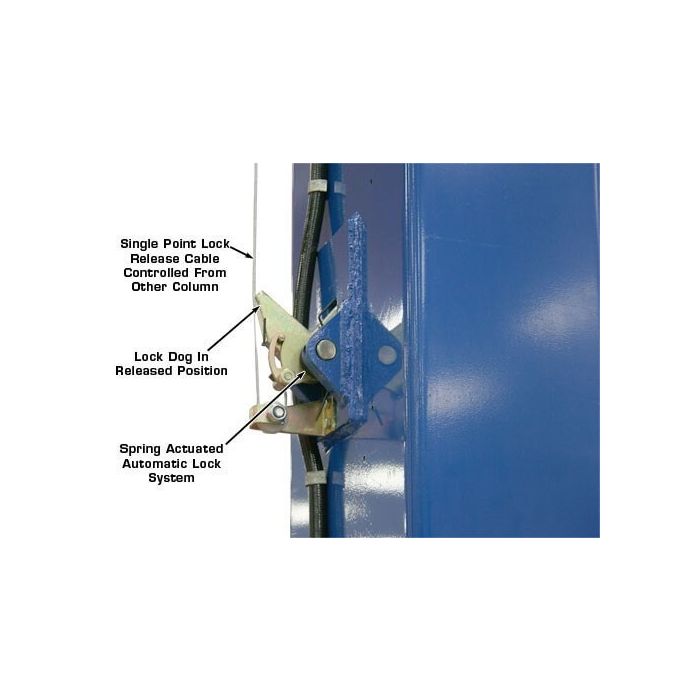This Atlas Lift has a manual single point lock release that allows the operator to release all the safety locks at one time. The spring loaded lock handle and power unit dump valve must be activated at the same time. (two hand operation) If the lock handle is released and the dump valve handle is still being pressed, the lift will continue to descend and all locks will automatically re-engage at the next lower lock point.