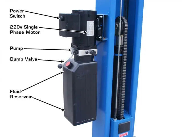 The electric motor for the power unit requires 220 Volt (single phase) 60 Hz (+/- 5%, so 209-231 volts). We recommend using at least a 10 gauge (grounded) wire from the electrical panel. The power unit may or may not have a short pigtail (no plug) that can be wired to either an optional quick disconnect box (mounted on the lift column) or to a male/female plug combination. A 30 amp breaker is required.