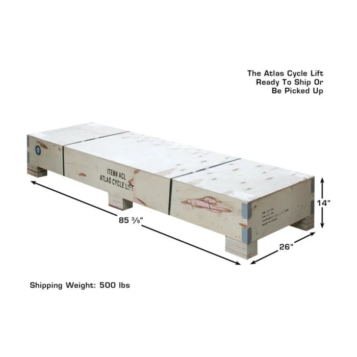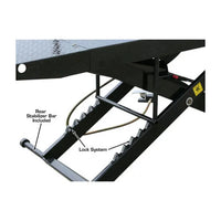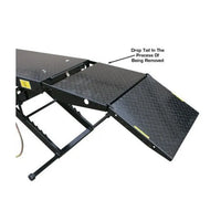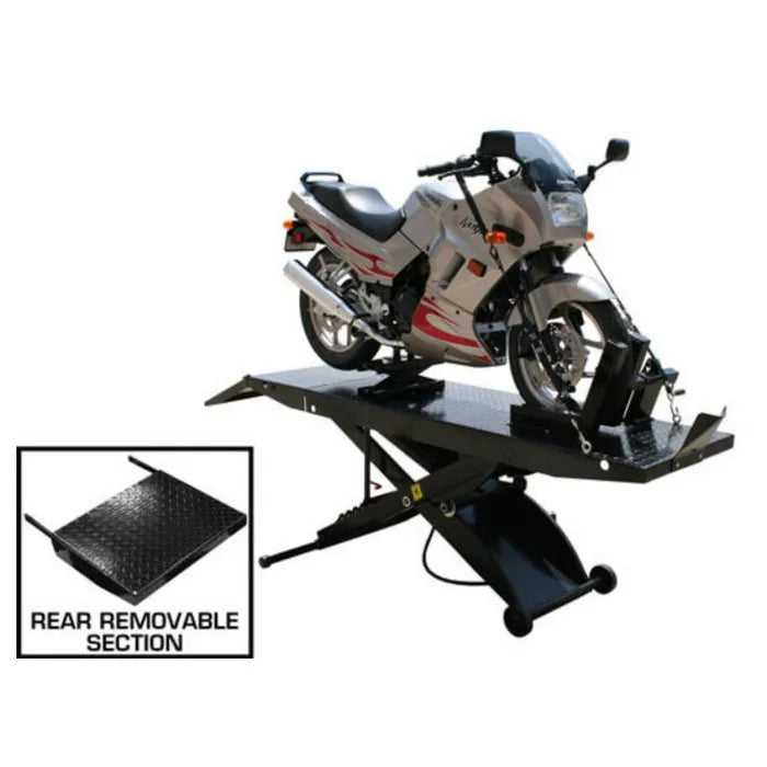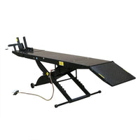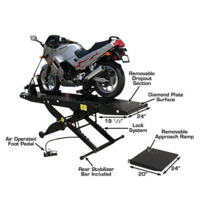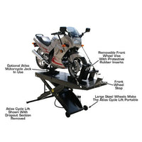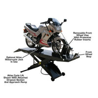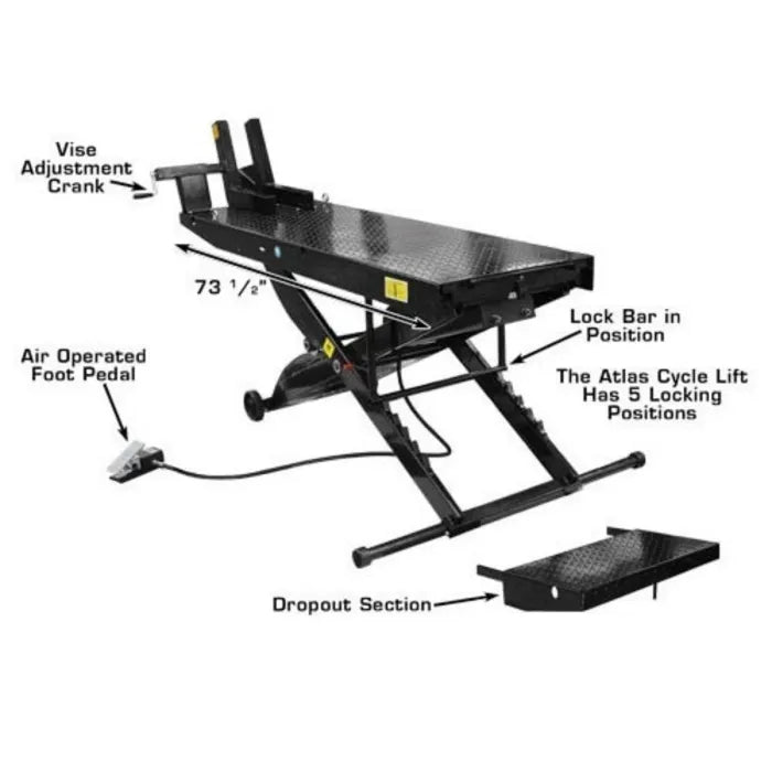 The Atlas CycleLift Motorcycle lift has one of the industry's longest (standard) platforms to accommodate extra long motorcycles. The motorcycle lift has a heavy gauge diamond plated platform length of 93 inches and an additional 20 inch removable approach ramp. Includes removeable rear drop out panel, padded front wheel vise, stabilizer bar, heavy-duty air operated foot valve, and approach ramp. ATVs can be accommodated with optional side extension kit.