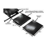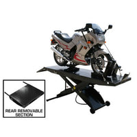 The Atlas CycleLift motorcycle lift comes standard with a 20" removable rear section. This 20" section can be easily removed so that a rear tire can be "dropped straight down" from the rear axle. Since the entire platform width is removed, any sized rim can be lowered from the axle.