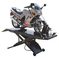 The Atlas CycleLift Motorcycle lift has one of the industry's longest (standard) platforms to accommodate extra long motorcycles. The motorcycle lift has a heavy gauge diamond plated platform length of 93 inches and an additional 20 inch removable approach ramp. The Atlas CycleLift is air operated and requires between 90-100 PSI to operate. The CycleLift is the perfect addition to any service department of professional motorcycle dealers or is a great motorcycle lift for the person who wants to work on his personal bike in their own garage.