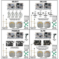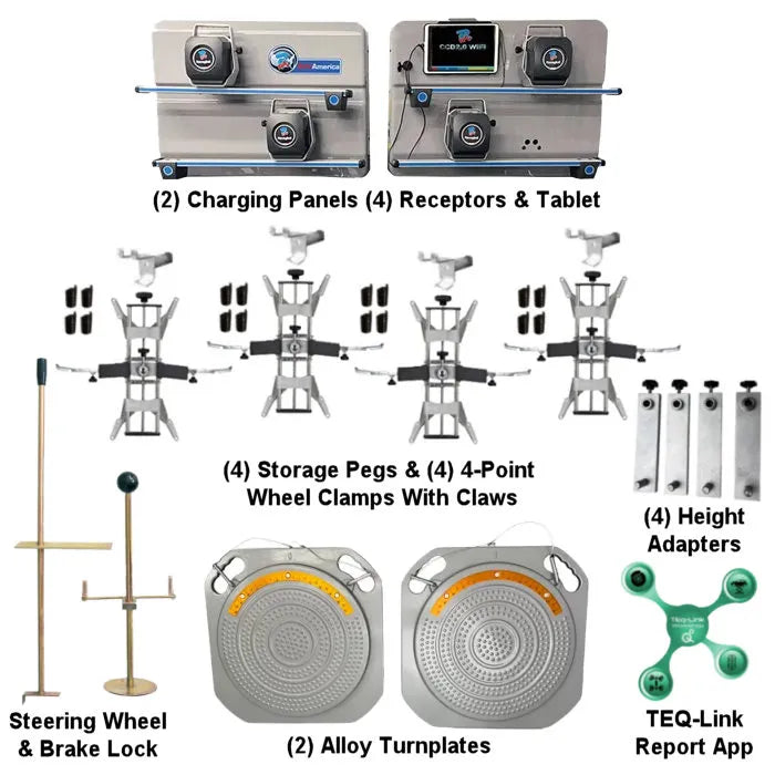 This is the Deluxe Package of the TD2.0 Alignment System and comes standard with (4) STDA46EU 4-Point Non-Runout Technology Wheel Clamps, (2) Charging Panels for Instruments, (4) Wall Storage Pegs for Wheel Clamps, (4) Two Post Lift Height Adapters, (2) Alloy Turning Plates, Steering & Brake Locks, and TEQ-LINK Report Application.