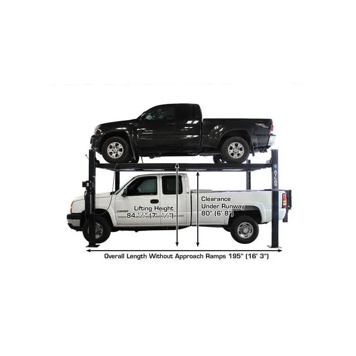The Atlas Garage Pro 8000EXT is capable of lifting your pick up truck or car 84 1/4 inches. This above ground lift is the perfect choice for storing your vehicle. The extended height feature of the Atlas Garage Pro 8000EXT Plus makes this lift the perfect choice for parking taller vehicles under stored vehicles.