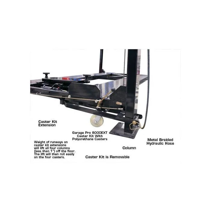 The Atlas Garage Pro 8000EXT comes standard with a powerful 110 volt power unit. A 30 amp breaker is required. The portable Atlas Garage Pro 8000EXT includes a caster kit with polyurethane wheels. The caster kit can be installed or removed in just a matter of minutes and requires no tools.