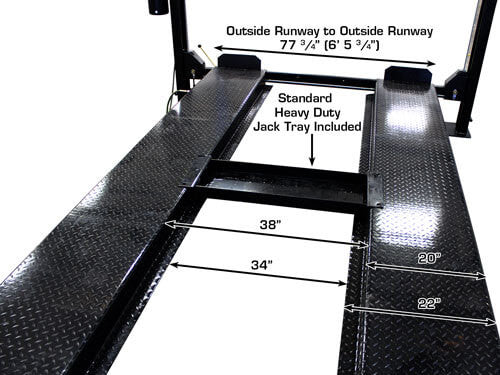 Includes Heavy Duty Jack Tray - The sturdy jack tray allows for the use of floor jacks or bottle jacks to raise part of any vehicle positioned on the lift. The versatile Jack Tray is also great for holding tools when working under a vehicle or as a catch tray when changing fluids or replacing parts. The jack tray features a heavy duty design for safe, reliable support. The jacking tray can also be easily moved from one end of the lift to the other so you can position it where necessary for each job.