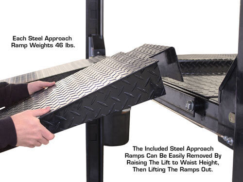 Includes Approach Ramps - The included steel approach ramps can be easily removed by raising the lift to waist height, then lifting the ramps out. Each steel approach ramp weighs 46 lbs.