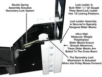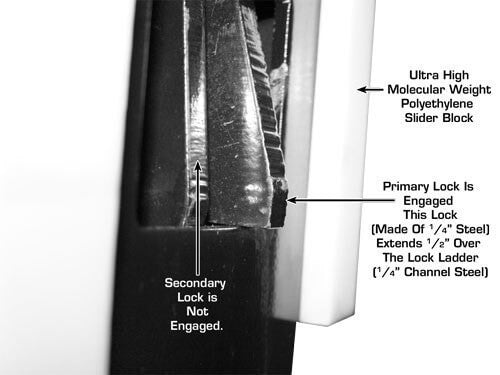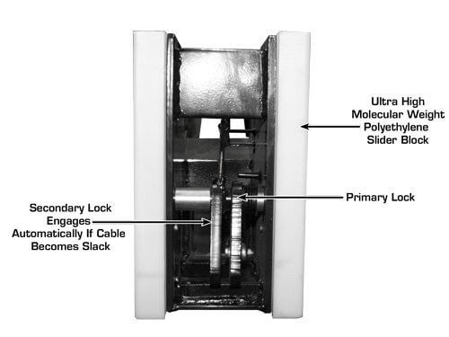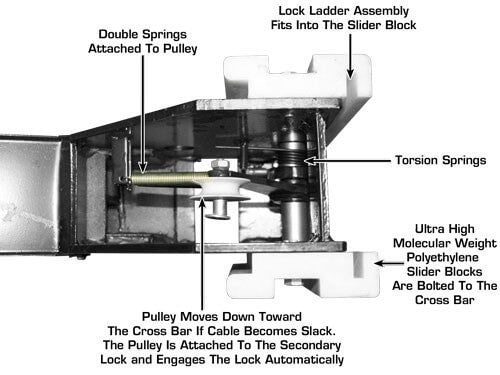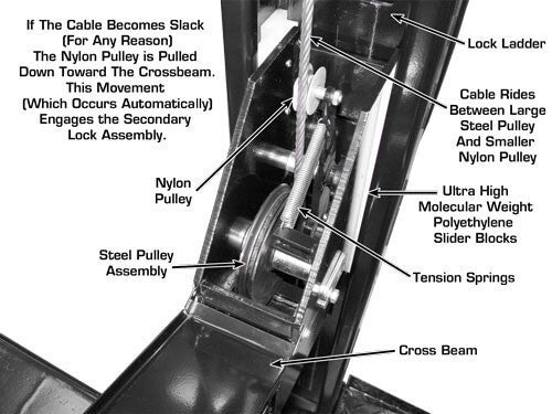 Double Lock Safety System - This Atlas Lift locking system offers a unique two position locking mechanism found only in commercial grade cable style four post lifts. The Double Lock Safety System is found exclusively on the Atlas Garage 408SL, Atlas Garage 409HP, Atlas Garage Pro 8000, the Atlas Garage Pro 9000, and the Atlas ST-7000. The Double Lock Safety System is designed to ensure that if a lifting cable becomes slack (for any reason), the secondary locking mechanism automatically engages. This Double Lock Safety System is found only on other four post above ground lifts costing hundreds of dollars more.