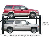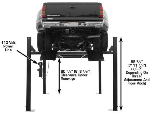 The Garage Pro 9000 can lift your pick-up truck or car up to 85 inches in the air. This above ground lift is the perfect choice for parking taller vehicles under your stored vehicle. The commercial grade features of the Garage Pro 9000 make this lift the perfect choice for automotive service center or Mr. Homeowner that needs a PORTABLE professional four post lift at a competitive price.