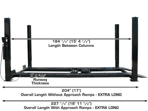 This Atlas Garage Pro 9000 4 post lift can accommodate a 187" vehicle. The Atlas Garage Pro 9000 has the longest runways (we believe) of any portable 9,000 LB. four post on the market. The Atlas Garage Pro 9000 weighs about 300 LB. more than our Atlas Garage Pro 8000. The Atlas Garage Pro 9000 four post above ground lift incorporates many features that are not found in any of our competitors' four post lifts that are sold in the USA. This lift is a portable four post lift incorporating polyurethane casters on the caster kit to prevent damage to the garage floor.