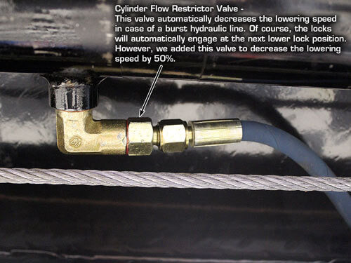 Single Point Lock Release - This Atlas Storage Lift has a manual single point release that allows the operator to release all the safety locks at one time. The spring loaded lock handle and power unit dump valve must be activated at the same time. (two hand operation) If the lock handle is released and the dump valve handle is still being pressed, the lift will continue to descend and all locks will automatically re-engage at the next lower lock point.
