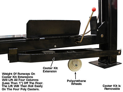 Includes Caster Kit with Polyurethane Caster Wheels - This Storage Lift comes standard with polyurethane wheels on the caster kit. These no-mark wheels allow the operator to roll the lift over an expensive epoxy floor with little risk of damage. Even if you have and old concrete floor, the polyurethane wheels on this lift make it easier to roll than the caster kit with the steel wheels. The caster kit can be installed or removed in just a matter of minutes and requires no tools.